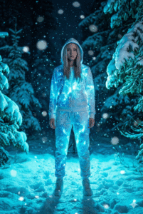 “Foto de corpo inteiro de uma jovem mulher num fato de treino futurista brilhante de pé numa floresta nevada à noite. O fato de treino é branco com padrões azuis bioluminescentes intensos que imitam uma nebulosa estrelada. Ela está vestindo um casaco com capuz e calças estilo jogger que emitem uma luz ciano brilhante, iluminando a neve sob seus pés. Neve suave está caindo, criando efeitos de luz bokeh no fundo escuro. Iluminação cinematográfica, atmosfera etérea, contraste alta hiper-realista, 8k, estética de inverno. “