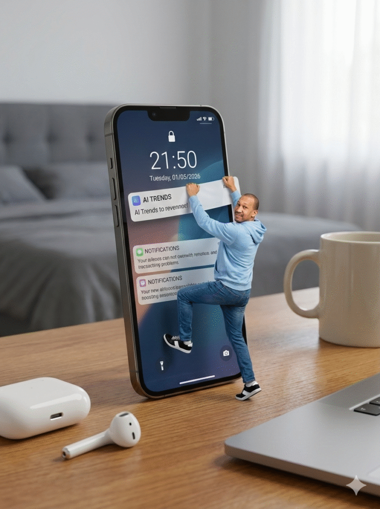 A hyper-realistic, 8k, high-fidelity image captured with a slight wide-angle lens at eye-level, showcasing a surreal scene with cinematic lighting and highly detailed textures. The composition features a modern smartphone, standing vertically upright on a warm wooden desk in the foreground, its screen displaying a vibrant blue lock screen with the time “21:50” and date “Tuesday, 01/05/2026” at the top, along with three notification cards. A miniature person, scaled to be tiny relative to the phone, is actively climbing the phone screen, holding onto the top notification card (a AI TRENDS notification) with both hands, as if it’s a physical banner being pulled upwards. The character, wearing a light blue hoodie, blue jeans, and black and white sneakers, looks out towards the viewer with an expression of effort and a slight smile, with uploaded face as reference. On the wooden desk, to the left of the phone, are a white AirPods charging case and a single white AirPod. To the right, a light beige ceramic mug and the corner of a closed silver laptop are visible. The background, softly blurred with volumetric lighting, reveals a cozy bedroom setting with a bed featuring a grey comforter and headboard, and a window with white curtains allowing soft, natural light to illuminate the scene from the right.