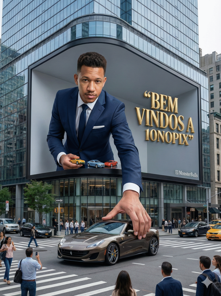 A giant fashion curve edge 3D anamorphic billboard on the side of a modern building in a busy crossroad. On the 3D billboard is a young man (from attached image) styled in an office outfit. He’s playing with a car toys inside billboard but his hand come out off the billboard and holding the actual size car on the street. Next to him, bold text styled like a luxury fashion slogan reads: “BEM VINDOS A” with tagline “10NOPIX” inside 3D billboard. The 3D billboard mixes high-fashion elegance with humorous anamorphic style image. Put on bottom corner inside billboard a signature style text “El MonsterBulls “. Photorealistic, stylish, culturally modern, and meme-inspired. 3:4 framing.