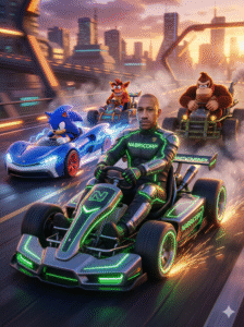 Ultra-cinematic, hyper-realistic racing scene inspired by 90s iconic videogame legends.