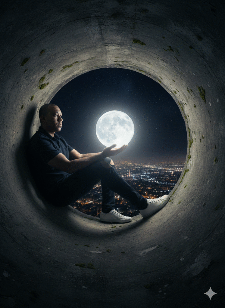 A hyper-realistic, 8k, cinematic wide-shot captured with a slightly low-angle perspective, looking into the circular opening of a massive, weathered concrete pipe. The composition features a male subject leaning against the inner left wall of the pipe, with legs bent and feet resting on the inner right wall. The subject is wearing a dark short-sleeved collared shirt, dark ripped jeans, and white sneakers. Their hair is dark and well-groomed, with a short beard. The subject’s face is uploaded face as reference. In a surreal, forced-perspective arrangement, the subject appears to be holding a large, glowing full moon between their cupped hands, which is centrally positioned within the pipe’s opening. The moon acts as a primary light source, casting a bright, ethereal glow and providing rim lighting on the subject’s right side, while the left side is in deep silhouette. Beyond the pipe’s opening, a sprawling, distant city skyline with twinkling lights stretches across the horizon, creating a bokeh effect. Above the city, a deep, dark night sky filled with countless stars and subtle nebulous glows provides a dramatic backdrop. The concrete pipe itself shows highly detailed texture, illuminated by ambient light from the background. The overall lighting is dramatic and moody, emphasizing the contrast between the glowing moon and the dark surroundings, creating a dreamlike, otherworldly atmosphere.