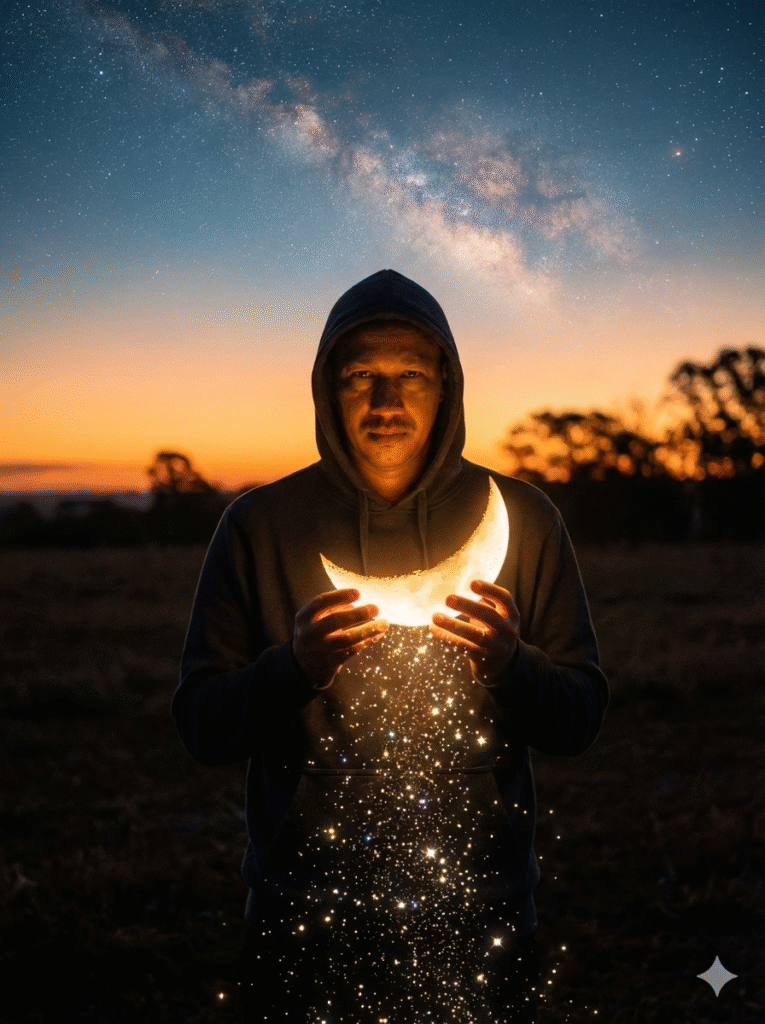 A hyper-realistic, 8k, cinematic shot captured with a 35mm lens and a slightly low-angle perspective, showcasing a surreal scene at twilight. The composition features a person, uploaded face as reference, wearing a dark hoodie, standing in a vast, dark field. The subject is holding a luminous, ethereal crescent moon in their hands, which acts as the primary light source, casting a soft, warm glow upwards onto their face and the front of their hoodie. From directly above the crescent moon, a dense, sparkling stream of countless tiny stars or light particles pours down, creating a magical, volumetric light effect that illuminates the air around the subject’s head and shoulders. The background reveals a breathtaking twilight sky, transitioning from a warm, vibrant orange and pink sunset gradient at the horizon to a deep, star-filled blue at the top, with a clear Milky Way-like band of stars visible. Silhouetted trees are faintly visible on the distant horizon line to the left. The foreground is dark and indistinct, emphasizing the glowing subject. The overall lighting is dramatic and magical, with highly detailed textures on the hoodie and an ethereal quality to the glowing moon and falling stars, creating a sense of wonder and magical realism.