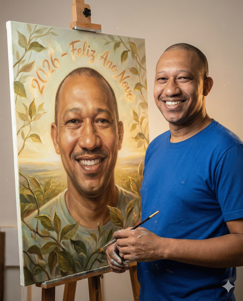 A pintura na tela é um retrato pintado realista da mesma pessoa de referência, claramente reconhecível e fiel à sua identidade. A versão pintada representa crescimento, frutificação e impulso positivo para o próximo ano.