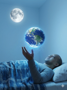 A hyper-realistic, 8k, low-angle shot captures a dreamlike scene with cinematic lighting, focusing on a person lying on their back in a dimly lit, light blue room. The subject, with uploaded face as reference, is seen from the chest up, wearing a grey long-sleeved shirt and covered by a highly detailed, textured blue blanket with a subtle pattern, resting on a white pillow. Their right hand is gently raised towards a miniature, glowing Earth, approximately the size of a large grapefruit, which floats just above their palm. This hyper-detailed Earth displays continents (specifically North and South America), swirling clouds, and vibrant blue oceans, enveloped in a strong, ethereal blue glow with tiny sparkling particles emanating outwards. Higher up and to the left, a smaller, hyper-detailed full moon with visible craters glows intensely against the light blue ceiling. The entire composition is bathed in soft, volumetric blue light originating from the celestial objects, creating a magical and contemplative atmosphere with highly detailed textures throughout.