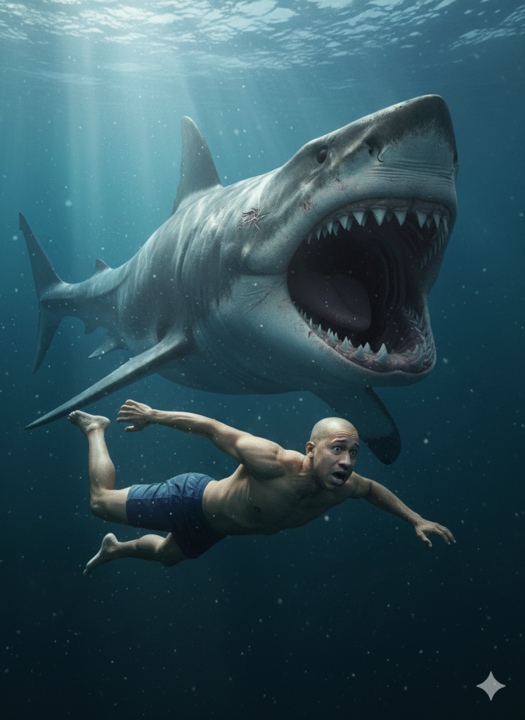 “Imagen hiperrealista y cinematográfica de una escena bajo el agua. Un hombre joven (basado en la foto proporcionada) aparece nadando completamente sumergido en las profundidades del océano azul marino. Justo detrás de él, un enorme y aterrador Megalodón lo persigue con las fauces abiertas de par en par, mostrando hileras de dientes blancos, afilados y triangulares, con una lengua de color rojo vino oscuro. El rostro del hombre es claramente visible bajo el agua, mostrando una expresión de absoluto terror y desesperación mientras intenta escapar. La iluminación es dramática, con rayos de sol filtrándose desde la superficie (god rays) hacia el fondo, iluminando las partículas en el agua y la textura rugosa de la piel del tiburón. Estilo de película de suspenso, alta resolución, gran nivel de detalle y sensación de peligro inminente.”